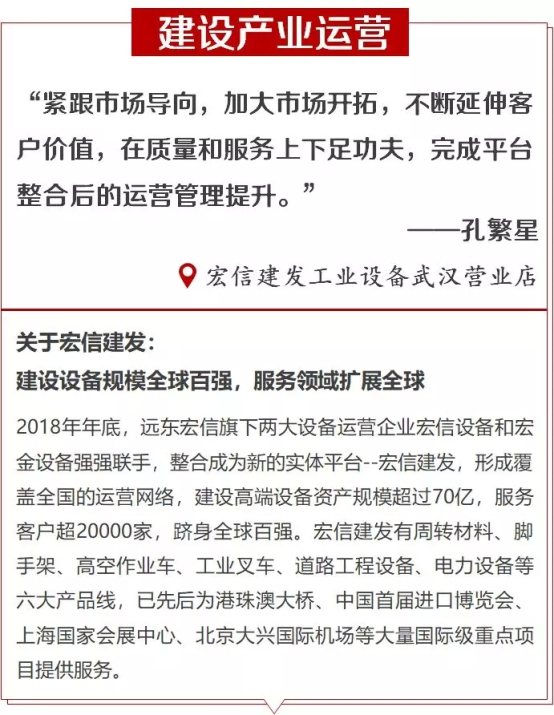 孔总表示,工业设备武汉营业店近年来发展迅猛,今年,宏信建发的重点工作是完成平台整合后的运营管理提升。要继续凝心聚力,紧跟市场导向,加大市场开拓,不断延伸客户价值,在质量和服务上下足功夫。