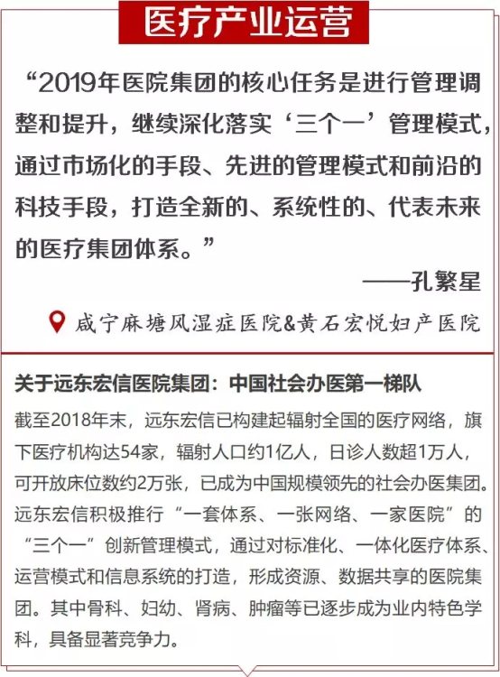 孔总强调,医疗健康是远东宏信的核心战略板块,公司将以目前的2万张床位为基础,进一步深化全国医院布局,落实“一套体系、一张网络、一家医院”的运营管理模式,通过市场化的手段、先进的管理模式和前沿的科技手段,打造一个全新的、系统性的、代表未来的优质医疗体系,造福更广大的人民群众。