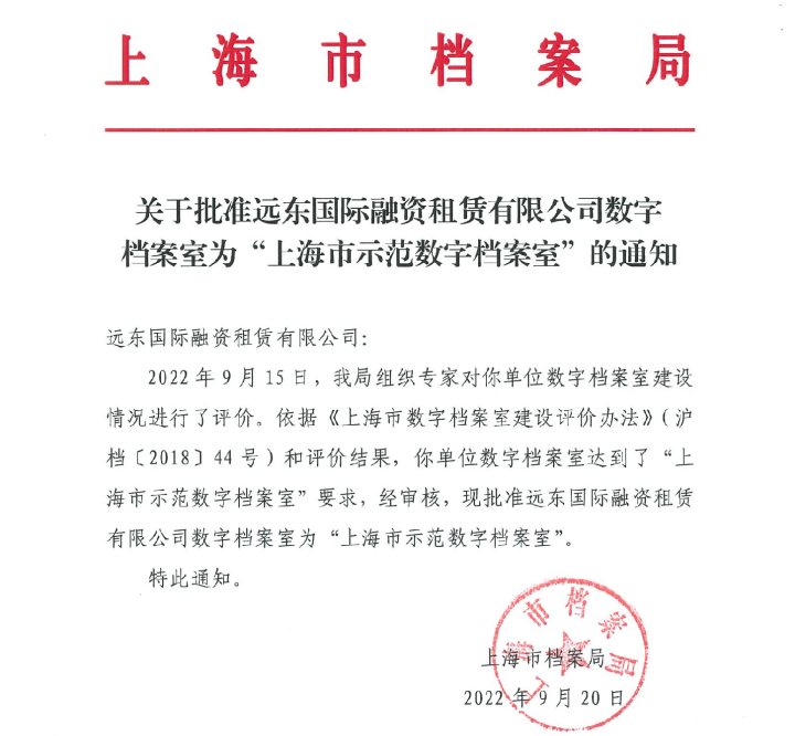 追求卓越,精进服务!远东租赁获评“上海市示范数字档案室”